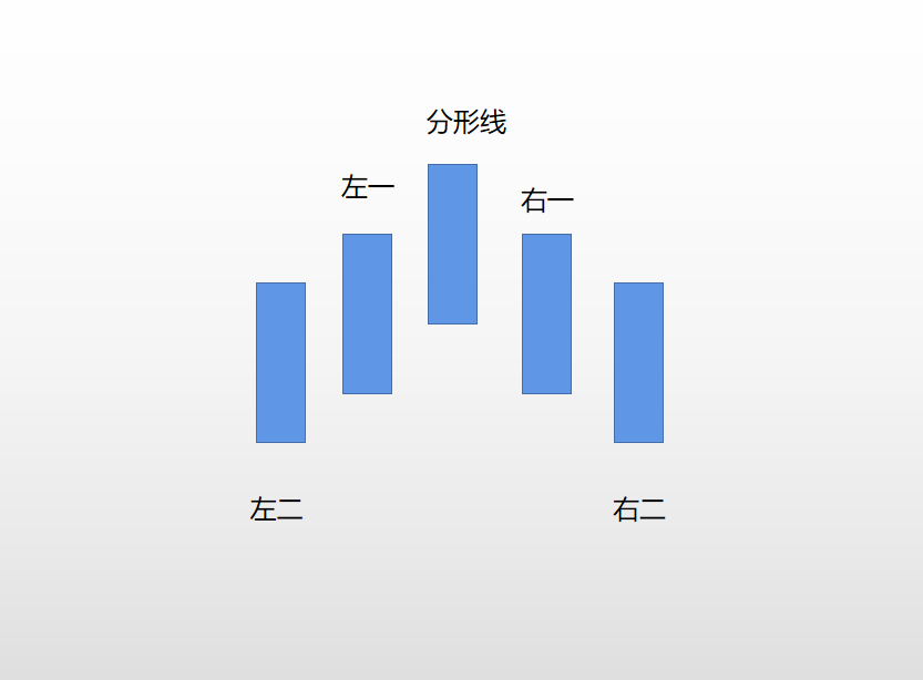 当中间的K线最高点高于左右各两根K线的最高点,则构成顶分形;当K线最低点低于左右各两根K线的最低点,则构成底分形。顶分形代表阻力位,底分形代表支撑位,它们都符合文首所提到的阻力支撑通俗定义。上涨波段和下跌波段的循环,实际就是顶分形和底分形的循环。底分形出现之后,预示未来将出现上涨波段;顶分形出现之后,预示未来将出现下跌波段。更详细的命名规则是:一个分形由五根K线构成,最左侧的K线叫做“左二”,中间的K线叫做分形线,最右侧的K线叫做“右二”,与分形线相邻的左侧K线叫做“左一”,与分形线相邻的右侧K线叫做“右一”。如下图,顶分形和底分形的命名规则相同: