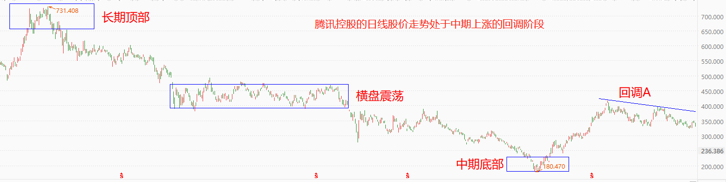 纯技术角度看,腾讯控股的日线股价走势处于中期上涨的回调阶段。2021年2月份新城各行长期顶部,2022年10月份形成中期底部,下跌走势持续了20个月左右。回调A持续时间约三个半越,但回调幅度非常有限,意味着多头资金不远放弃本轮中期反弹的良好结构。预计腾讯控股的股价仍有上涨动力,中期目标位可暂定为400港元(现价为339港元)。
