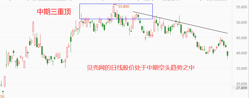 纯技术角度看,贝壳网的日线股价处于中期空头趋势之中。今年2月份,股价形成中期三重顶,之后开启中等速率的下跌走势。从中期最高点55.8港元至最新价38.85港元,累计跌幅超30%。一季度财报公布后,今日,贝壳网股价下跌7.19%,表明股市资金对业绩数据非常不满意。以当前的跌势分析,贝壳网股价有较大概率在近期跌破35港元关口。