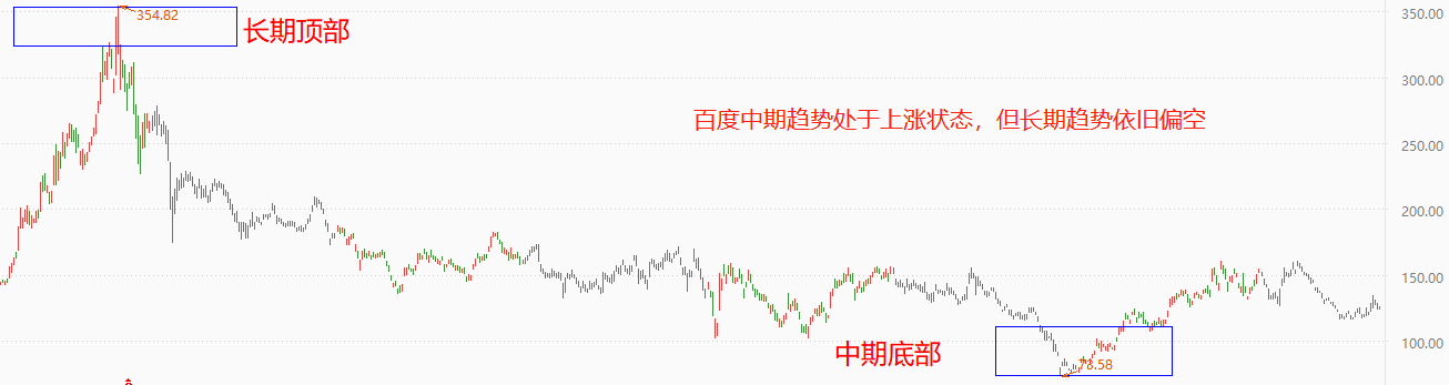 纯技术角度看,百度(美股)中期趋势处于上涨状态,但长期趋势依旧为空头。自2021年2月份形成长期顶部以来,百度的股价一蹶不振,长期处于下跌或者盘整状态。2022年10月份开启反弹,但是在今年3月份再次回落。一季报或许会对百度的股价形成短期提振,但长期看,百度的反弹力度偏弱,上破160阻力的可能性小于下破100支撑的概率。