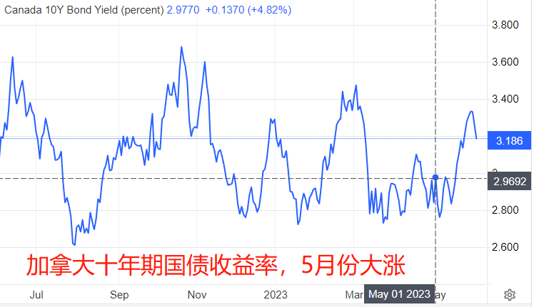 为什么加元的贬值幅度如此之小?相对坚挺的石油价格或许是主要影响因素。5月份,国际原油价格下跌12%,看起来幅度非常大,但是,WTI价格仍维持在70美元附近。加拿大的原油储量中98%以油砂形式存在,开采难度低,每桶油的开采成本约为30美元。国际油价70美元的水平,能够对加拿大的宏观经济形成提振。今年3月份,加拿大央行利率决议宣布暂停加息,结束了维持一年多时间的紧缩货币政策。加拿大央行行长麦克鲁姆讲话称:“我们已经暂停加息,但并不意味着本轮加息周期已经结束”。率先停止加息的国家,货币会倾向于贬值。但是,3月份以来,加拿大十年期国债收益率在逐步走高,代表金融市场仍在强烈预期加元的流动性紧张。综上所说,加元的贬值幅度在十大主流货币中最小,便合情合理。