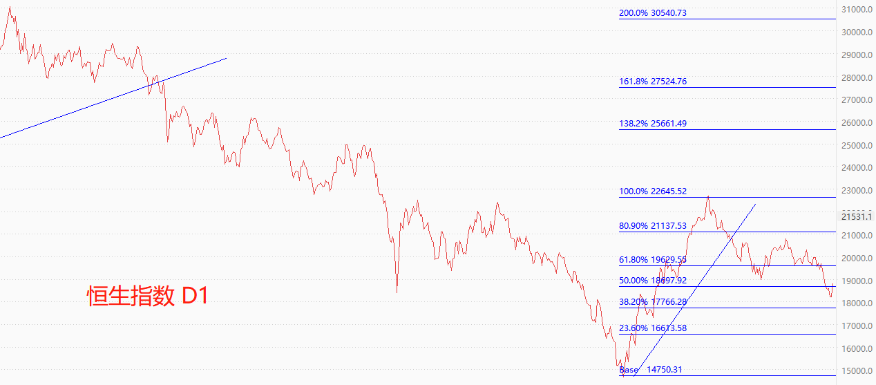 技术角度看,恒生指数处于中期空头趋势,短期为下跌波段。短线来看,市价已经跌至50%至61.8%分位之间,存在反弹动力。短期支撑位为17766点,如果能在该价位之上形成支撑结构,则恒生指数有望重归20000点以上。