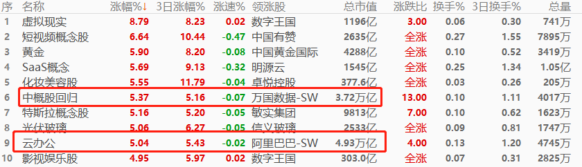 板块角度看,港股市场虚拟现实板块股以8.79%的幅度领涨,其次是短视频概念股和黄金板块。虚拟现实板块受追捧,与美股科技公司META发布“全世界第一款主流高分辨率彩色混合显示设备”(扎克伯格所述)Quest 3有关。大市值板块当中,中概股回归、云办公分别出现5.37%、5.04%、的较大涨幅,昨日两者已经出现在涨幅榜当中,超跌反弹行情延续。