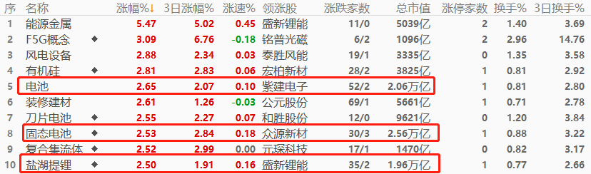 A股市场,能源金属板块以5.47%幅度领涨,其次是F5G概念和风电设备。能源金属板块的领涨个股为盛新锂能,基于锂矿的产业链走强格局显著。电池、固态电池、盐湖提锂属于万亿市值板块,三者的涨幅分别为2.65%、2.53%、2.5%,涨幅较大。前十大板块均属于锂矿产业链,可见今日的交易主线是新能源汽车和新能源电池。需要提醒的是,过去半年多时间里,新能源产业链整体处于下跌状态,今日的反弹能否在下周延续仍存疑,不可盲目乐观。