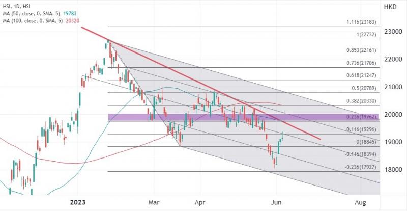 ATFX指,进入6月以来,港股升势连续跟进,反映技术上的回升,不过从资金流向上来看可能不利于当前升势大幅扩大,先关注19300阻力,更高区间在19762至20000点关口。但如果未能突破干草叉中线,则留意回吐近期涨幅,有再次向18000关口靠近的倾向。