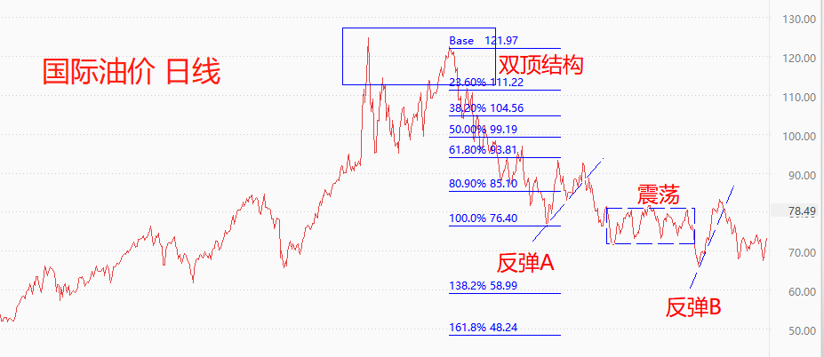 技术角度看,WTI处于长期空头趋势下的顺势下跌波段,受消息面影响,短期内有反弹迹象。WTI价格在4月中旬跌破反弹B趋势线,但下跌走势一波三折,5月份甚至出现窄幅震荡的特征。由OPEC+和沙特所引起的短线反弹,有可能扩大成为中期反弹,原因是此前的做空力量呈现出显著的“不坚决”的特征,多头力量将有机可乘。短期阻力位75美元,中期阻力位80美元,本轮反弹触及短期阻力位的可能性较大。