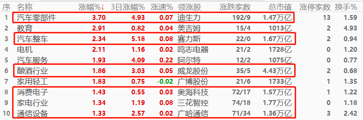 A股市场,汽车零部件板块以3.7%幅度领涨,其次是教育和汽车整车。教育板块曾在上周五大跌,今日上涨有技术性反弹的特征。涨幅榜前十当中,万亿市值板块占六席,权重板块扎堆走强,预计今日上证指数、深证成指有可能出现“欲扬先抑”的后发涨势。与汽车相关的板块占据四席,成为今日的交易主线。