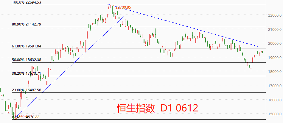 技术角度看,恒生指数中短期仍处于下跌趋势中。上周累计上涨2.32%,表现超出预期。但是,市价仍受到下降趋势线的压制,本周成为能否突破的观察期。短期阻力位19591点,支撑位18632点,最新市价19279点。今日上午盘下跌0.57%,如果下午盘没有出现逆转,则本周开局不利。由于货币政策层面的利空消息逐渐消退,恒生指数的长期判断倾向于看多。