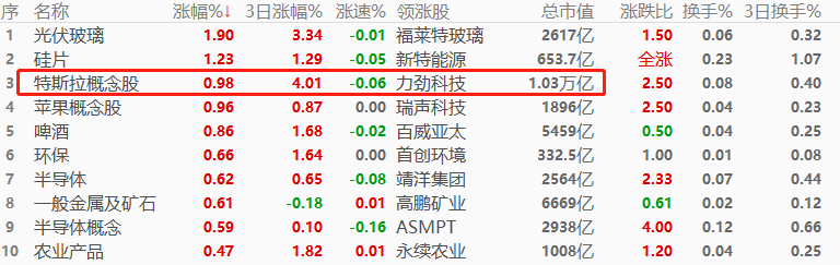 板块角度看,光伏玻璃以1.9%的幅度领涨,其次是硅片和特斯拉概念股。涨幅榜前十中,超过万亿市值的板块仅有特斯拉概念股,缺乏权重板块的集体助力,今日恒生指数恐表现不佳。与半导体有关的板块占据六席,成为今日交易主线。