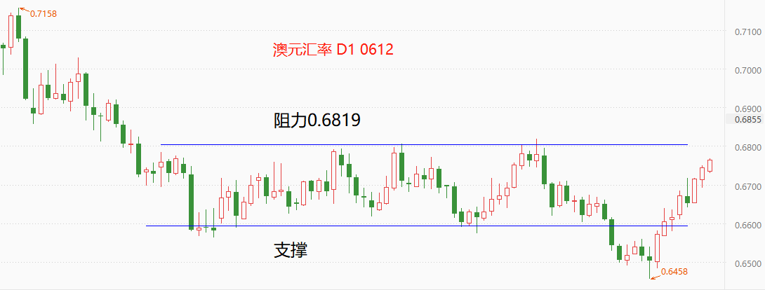 技术角度看,澳元汇率从支撑区域向阻力区域运动,即将触及阻力位0.6819,考虑到本轮上涨结构极其流畅,本周突破0.6819的概率较高。澳洲联储超预期加息,紧缩货币政策仍在延续,这与美联储即将停止激进加息的预期形成鲜明对比,澳元因此走强。另外,澳元是商品货币,币值与铁矿石期货存在共振性。5月26日至今,铁矿石期货累计涨幅达到15.35%,成为驱动澳元升值的主要力量。通过对比铁矿石期货和澳元汇率的日K线走势图可以发现,两者的形态极度相似。今日,铁矿石期货大跌1.81%,澳元汇率有可能受到拖累。