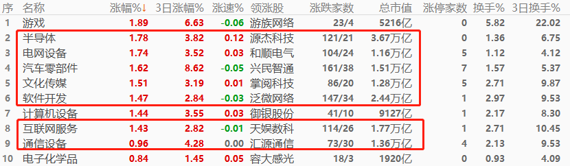 A股市场,游戏板块以1.89%幅度领涨,其次是半导体和电网设备,两者的总市值均在万亿规模以上。游戏板块领涨的情况不多见,从板块K线图来看,多头趋势结构非常稳固,值得重点关注。涨幅榜前十当中,万亿市值板块占7席,权重板块扎堆走强,预计今日上证指数、深证成指将有不错表现。不过,涨幅榜各个板块之间的关联度较弱,无法形成明显的交易主线。