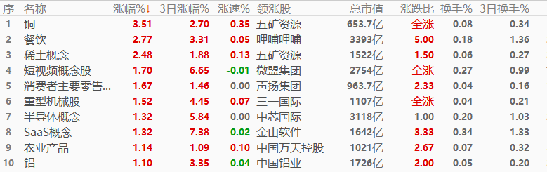 板块角度看,铜板块以3.51%的幅度领涨,其次是餐饮和稀土概念,三个板块总市值均在3500亿之下,对恒生指数的带动作用不强。涨幅榜前十中,超过万亿市值的板块为零,不足2000亿的板块有七席,意味着今日中小盘股表现将整体优于大盘股。涨幅榜当中,板块之间的内在关联性较弱,今日缺乏显著的交易主线。