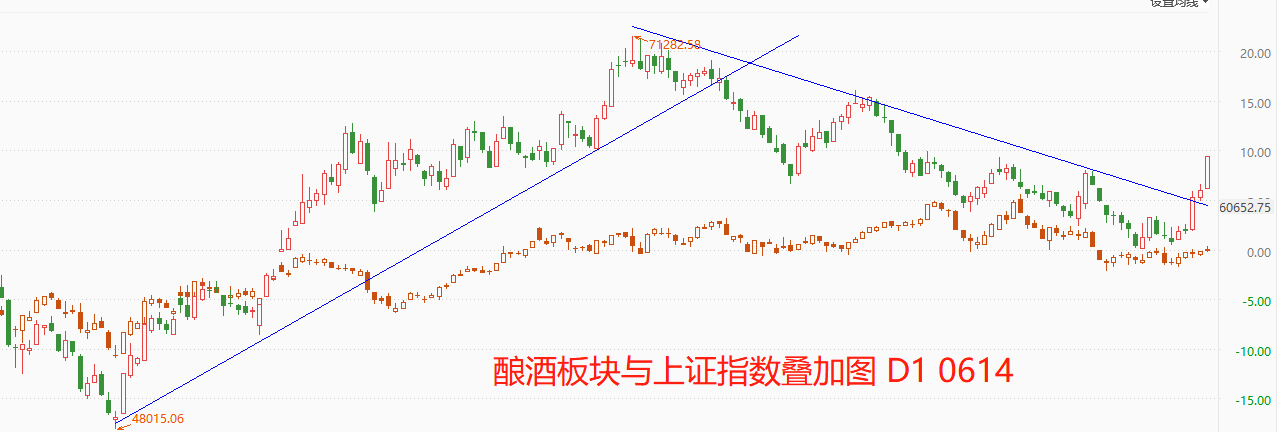 酿酒板块与上证指数的共振性非常明显,前者甚至有主导后者的迹象。最近三个交易日,酿酒板块累计上涨7.36%,并且突破上图中的下降趋势线,具有开启驱动型上涨的特征。版块内涨幅最大的是金枫酒业和古越龙山,两者均实现涨停。龙头股贵州茅台仅上涨1.94%,五粮液上涨3.41%,两者表现相对良好。酿酒板块具有高市值、高利润、高股价的三大特征,板块内个股业绩优良、题材颇多,近期建议重点关注。