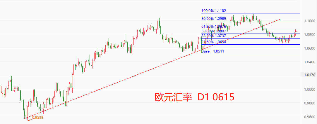 技术角度看,欧元汇率中期趋势处于多头状态。4月26日至5月31日的26个交易日,欧元汇率回调2.6%,最低点1.0635,触及0.764重要分位,随后开启涨势。最新市价1.0838,短期阻力位1.0876,短期支撑位1.0807。