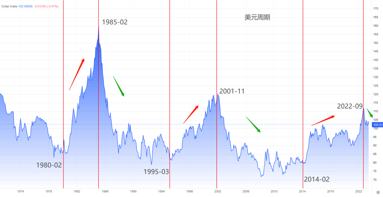 长周期角度看,1980年至今,美元指数经历了三轮强势周期,两轮弱势周期。强势周期持续时间分别为5年、6年、8年,如果剔除强势周期当中的漫长震荡期,则平均强势周期约为5年。弱势周期持续时间分别为10年、13年,剔除震荡期后,平均弱势周期约为8年。5和8均为斐波那契数列,且相邻。2022年9月份,美元指数创出114.79的数年高位,市价进入超买高估区。截至今日,美元指数市价102.53,累计跌幅超10%,初现筑顶迹象。如果美元指数市价跌破100点整数关口,并且美联储结束紧缩货币政策进入宽松周期,则美元的弱势周期基本确定。