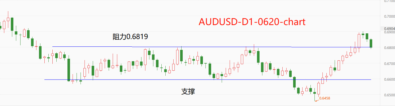 今年3月7日以来,澳元汇率围绕(0.6600~0.6820)中枢波动,市价每一次远离该中枢时,都会出现向中枢回归的动力。6月16日,澳元汇率涨至最高0.6900,出现原理中枢的迹象。最近两个交易日,澳元汇率累计下跌1.18%,开始向中枢上限0.6820回归。预计本轮下跌将会持续一段时间,直至市价跌破到中枢下限0.6600。