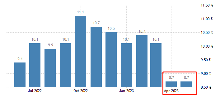 全球高通胀的局面正在显著缓解,但英国是个例外。英国5月CPI增速为8.7%,与前值持平,通胀率的回落速度不及市场预期。当前,美国的通胀率已经降低至4%,欧元区的通胀率降低至6.1%,只有英国的通胀率仍然高达8.7%,紧缩货币政策效果远逊于其它国家。我们判断,在英国通胀率跌至5%以下之前,英国央行不会停止加息路径。