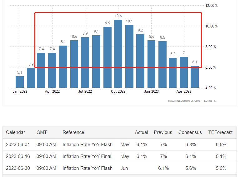 欧元区6月CPI年率初值,将于本周五17:00公布,前值为6.1%,预期值5.6%。如果数据符合预期,意味着时隔15个月之后,欧元区的CPI再次回到“5”开头的时代。通胀率的回落意味着欧央行紧缩货币政策取得显著成效,欧央行有可能效仿美联储“暂停加息”,以观察宏观经济的运行情况。另外,欧元区的失业率最新值6.5%,处于稳步下降态势,高利率对就业的负面影响尚未显现,欧央行仍存在较大的加息空间。