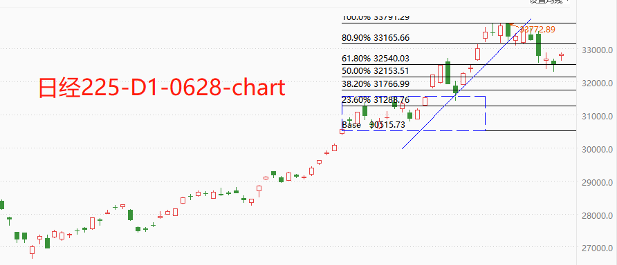 技术角度看,日经225指数的今日价格上破过去两个交易日的高点32884点,存在触底反弹的可能性。回调波段最低点尚未达到0.5分位,显示回调不充分。对于强势多头的市场来说,回调不充分意味着潜在买入力量雄厚,属于积极信号。如果今日收盘能够站稳32884点,则顺势上涨的驱动波段可期。