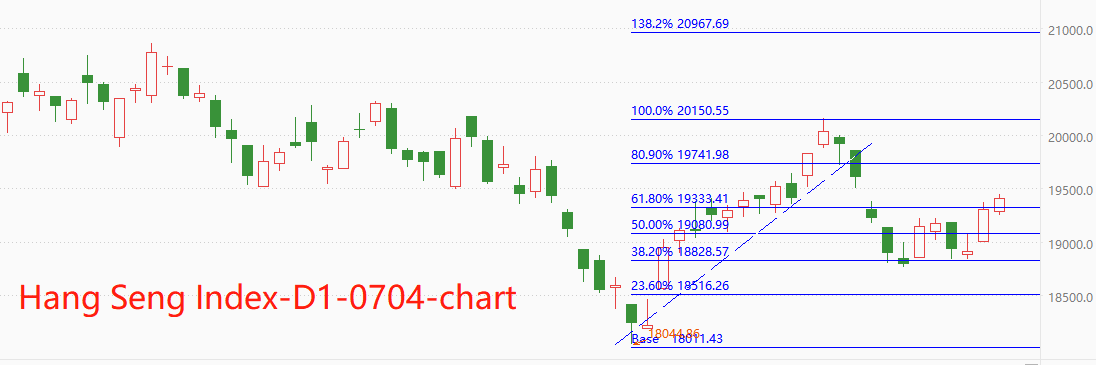 技术角度看,恒生指数最近24根K线构成的上涨结构非常稳固,预计6月27日开启的反弹走势还将持续较长时间。6月16至26日的下跌波段,最低触及前期上涨波段的0.618分位,已经达到“充分回调”的基本要求。如果消息面不出现重大利空的话,恒生指数有可能在7月份突破6月的最高点20155点。