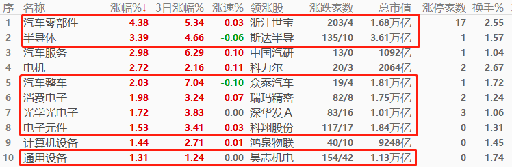 ▲ATFX图A股市场,汽车零部件以4.38%的幅度领涨,其次是半导体和汽车服务,前两大板块总市值均超万亿,其涨势对上证指数和深证成指的带动作用较强。涨幅榜前十当中,万亿市值板块仅占8席,权重板块总数占比极高,且排名靠前,A股上午盘涨势具有内驱力,延续性较强,下午盘或有更加超出预期的表现。涨幅榜当中,与“汽车”相关的板块占8席,形成今年交易主线。“汽车整车”板块在昨日同样位居涨幅榜前十,今日再次上榜,建议重点追踪。