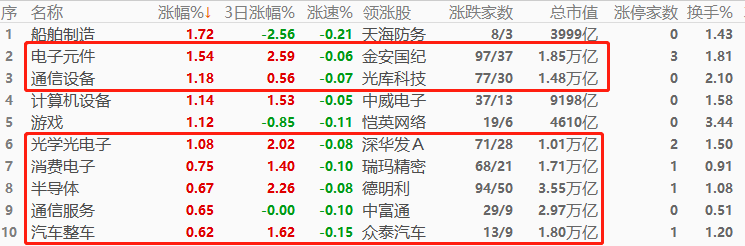 A股市场,船舶制造以1.72%的幅度领涨,其次是电子元件和通信设备。领涨的三大板块,涨幅均低于2%,不足以对A股指数形成显著带动作用。涨幅榜前十当中,万亿市值板块占7席,已经过半,下午盘有一定概率扭转跌势。涨幅榜当中,与“电子”相关的板块占9席,形成今日交易主线。
