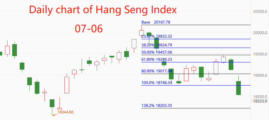 技术角度看,恒生指数的反弹结束,新一轮下跌波段开启。6月27日至7月4日的反弹,最高点达到19499点,触及前一轮下跌幅度的0.5重要分位。今日开盘跳空,可见悲观情绪浓厚。最新市价18522点,短期阻力位18764点,短期支撑位18203点。