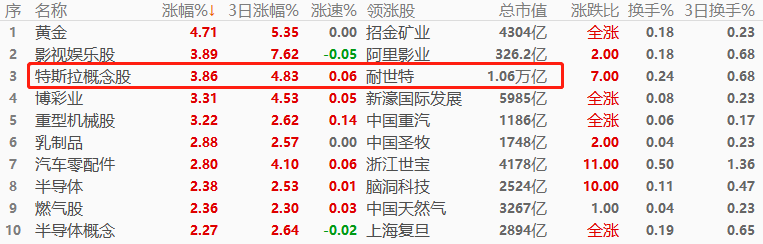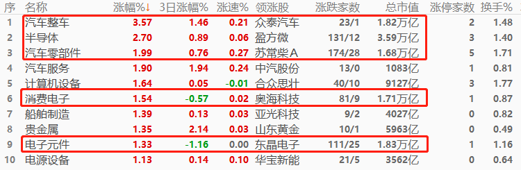 A股市场,汽车整车以3.57%的幅度领涨,其次是半导体和汽车零部件。领涨的三大板块,总市值均超万亿,且前两名涨幅均超过2%,对沪指和深指带动作用极强。涨幅榜前十当中,万亿市值板块占5席,数量众多,下午变盘的风险不大。涨幅榜当中,与“电子设备”相关的板块占5席,形成今日交易主线。A股三大权重板块:银行、酿酒行业、半导体的涨跌幅分别为+0.46%、-0.24%、+2.7%,涨跌互现,较难形成合力。