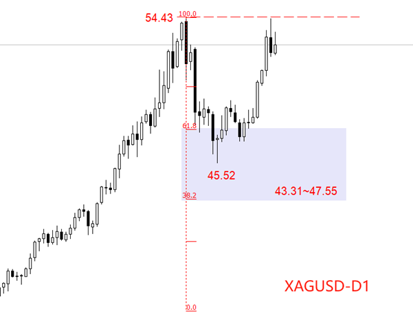 技术角度看,日线级别,白银XAGUSD处于长期多头趋势,10月28日以来的上涨可以定义为顺应趋势的新波段。10月17日~28日的下跌走势,最低触及45.52美元,达到前一轮上涨波段的0.382~0.618的黄金分割区间内,满足充分回调的条件。本轮反弹走势的结构较为稳固,预期持续性良好。需要提醒的是,市价在前期高点54.43附近极有可能面临较强的抛盘压力,昨日的长上影阴K线已经说明问题,市价在此处上下反复甚至直接回落的概率较高。