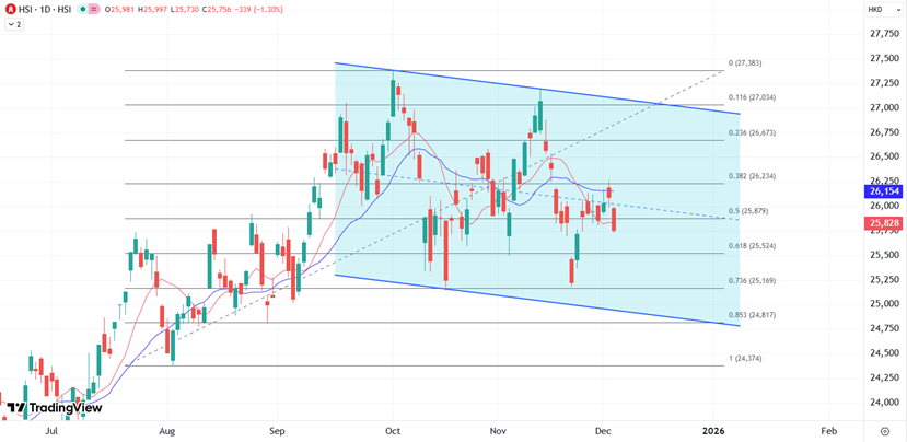 港股连涨两日后回吐,目前处于好淡相争的状态,和以往12月较为淡静的走势相符,当前回到26000关口下方,短线调整仍可能继续延伸。技术上自10月初以来的区间模式继续保持,跌破日图主要均线后,所以关注25500至25000在区间低位的关键支撑,也是重新展开反弹的关键。
