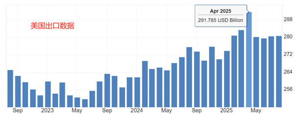 美国经济的衰退,除了就业市场给出信号外,出口数据同样拉响警报。历史数据看,今年5月份至今,美国的月度出口总额分别为2803.9亿美元,2796.5亿美元,2806.02亿美元,2808.32亿美元,均在2800亿美元附近原地踏步。在4月份特朗普开启大规模关税政策之前,美国的出口总额逐月升高,4月份甚至达到2917.85亿美元的年内新高。据此判断,如果特朗普的关税政策延续,美国的出口产业恐将从“原地踏步”状态进入“稳步下行”状态。