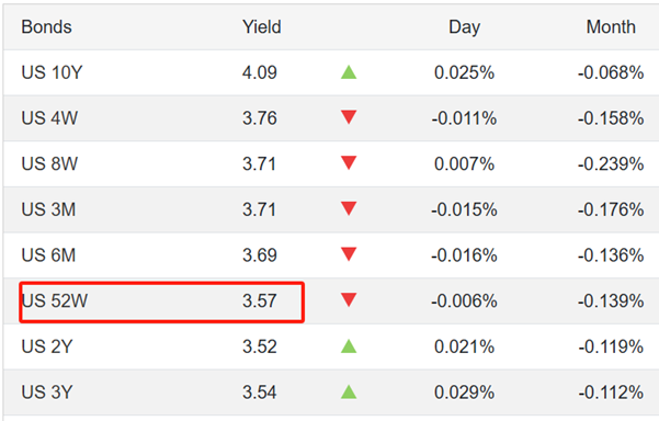 债券市场来看,美国的52W(一年期)国债收益率为3.57%,美联储的联邦基金利率区间为3.85~4%,两者相差28基点。由于美联储单次降息幅度为25的倍数,所以28基点的差距,意味着美联储将很快降息一次。另外,从中期来看,美国债券市场收益率存在倒挂迹象:4W大于8W,8W与3M持平,3M又高于6M~3Y的债券收益率。意味着美联储的降息不是一次性的,大概率会持续数年时间。