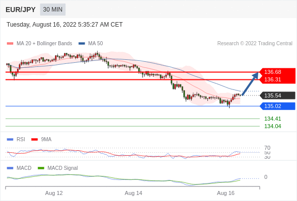 欧元/日元 当日内: 看涨。