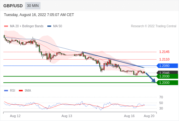 在 1.2080 之下,看跌,目标价位为 1.2030 ,然后为 1.2000 。