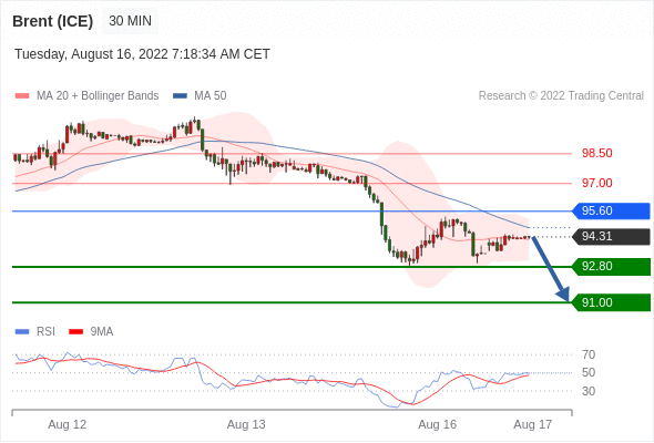 布伦特原油 (ICE)? (V2)? 当日内: 目标位为91.00。