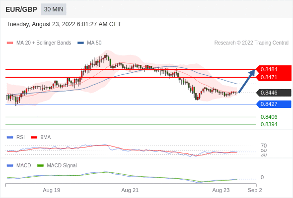 RSI技术指标小于中性区域50。 MACD技术指标呈现看跌状态并 处在其信号线的上方。 此外,价位处在其20天及50天移动平均线下方 ( 当前是 0.8448 和 0.8460 )。