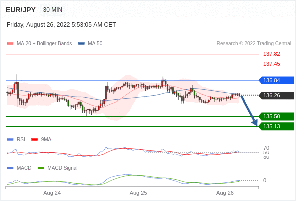 欧元/日元 当日内: 在进一步下跌之前,反弹至 136.84 附近。