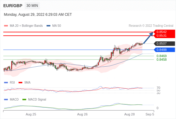 欧元/英镑 当日内: 看涨,当 0.8488 为支撑位,目标定在0.8542。