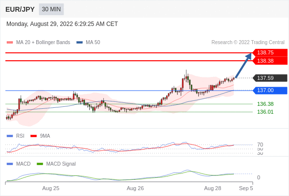 欧元/日元 当日内: 看涨,当 137.00 为支撑位。