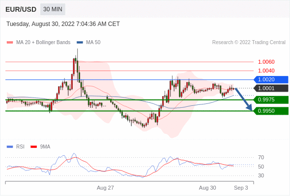 在 1.0020 之下,看跌,目标价位为 0.9975 ,然后为 0.9950 。