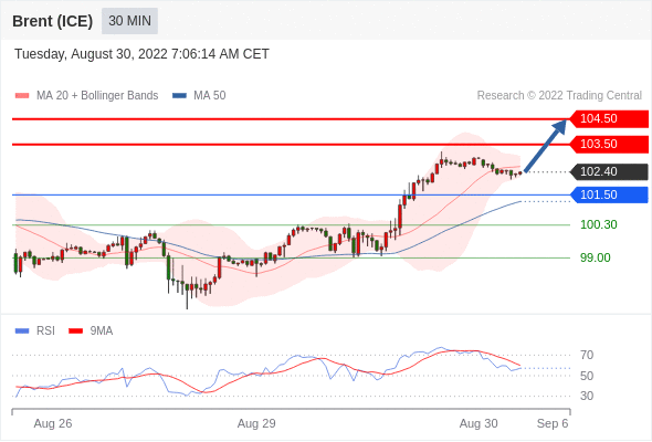 布伦特原油 (ICE)? (X2)? 当日内: 在101.50之上,看涨。