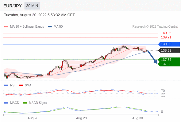 逐渐下跌,当 139.08 阻碍上行,则 137.30 为目标位。