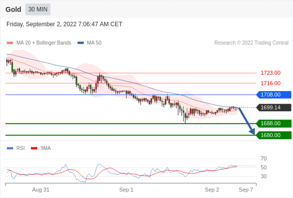 在 1708.00 之下,看跌,目标价位为 1688.00 ,然后为 1680.00 。