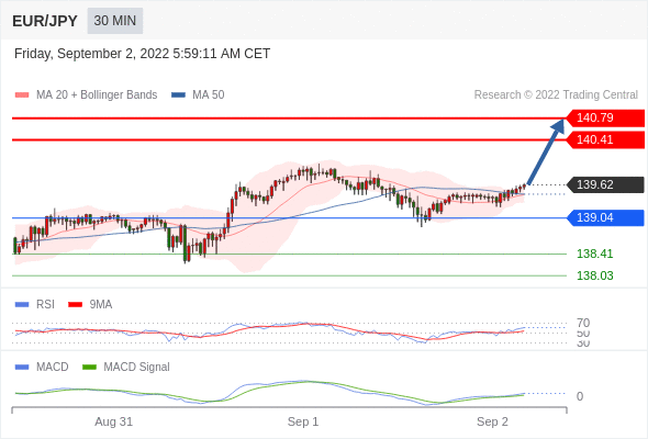 欧元/日元 当日内: 看涨,当 139.04 为支撑位。