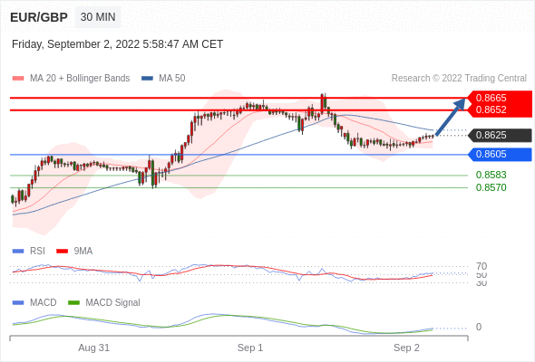 RSI技术指标超过50。 MACD技术指标呈现看跌状态并 处在其信号线的上方。 另外,价位在其50天移动平均线以下 ( 0.8631 ) 但高于20天移动平均线 ( 0.8619 )。