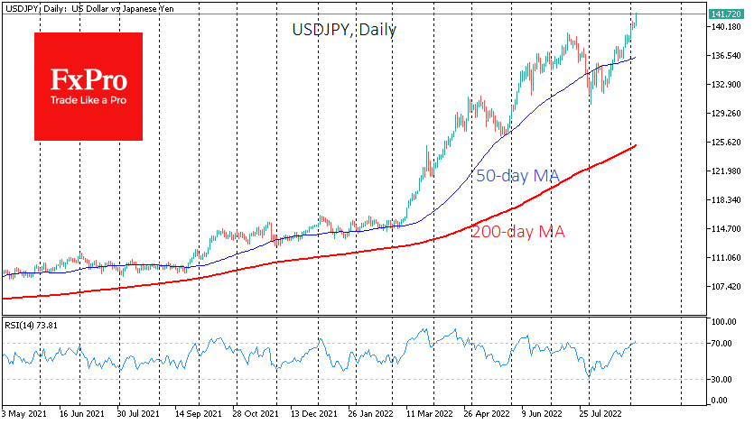 FxPro高级分析师Alex?Kuptsikevich指出:周二上午,美元兑日元在141上方,上一次出现是在1998年上半年。 在接近这些水平的时候,日本财务省干预了外汇市场,以阻止该国货币在几个月内崩溃。 1990年,美元兑日元大约四分之三的时间才突破140点,这是一次纠正性反弹。 自1987年以来,两家公司的股价从未持续高于当前水平。