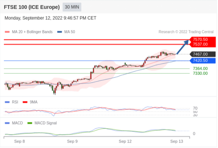 备选策略:向下跌破 7420.50 ,将带来继续下跌的趋势,目标位为 7364 然后为 7330 。