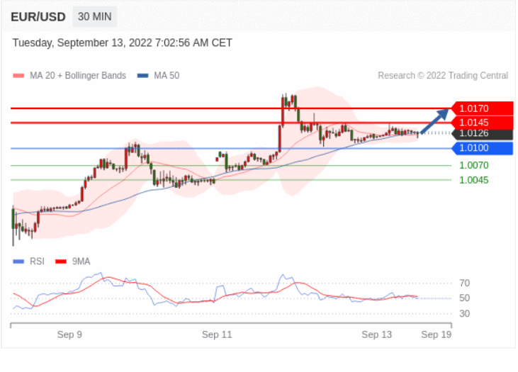 欧元/美元 当日内: 在1.0100之上,看涨。
