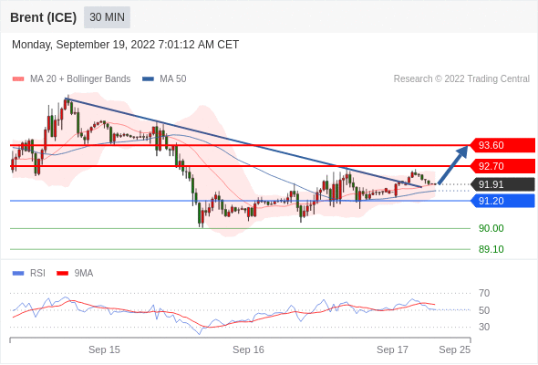 布伦特原油 (ICE)? (X2)? 当日内: 在91.20之上,看涨。