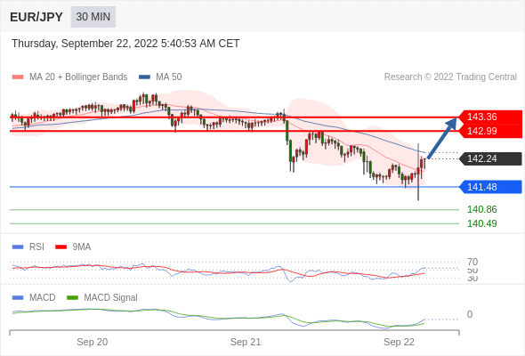 欧元/日元 当日内: 看涨。